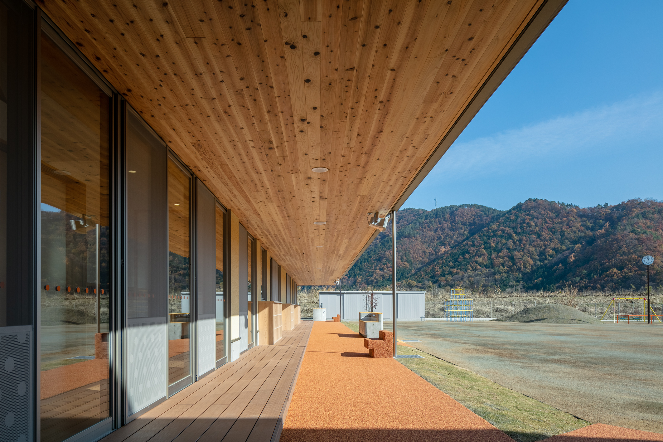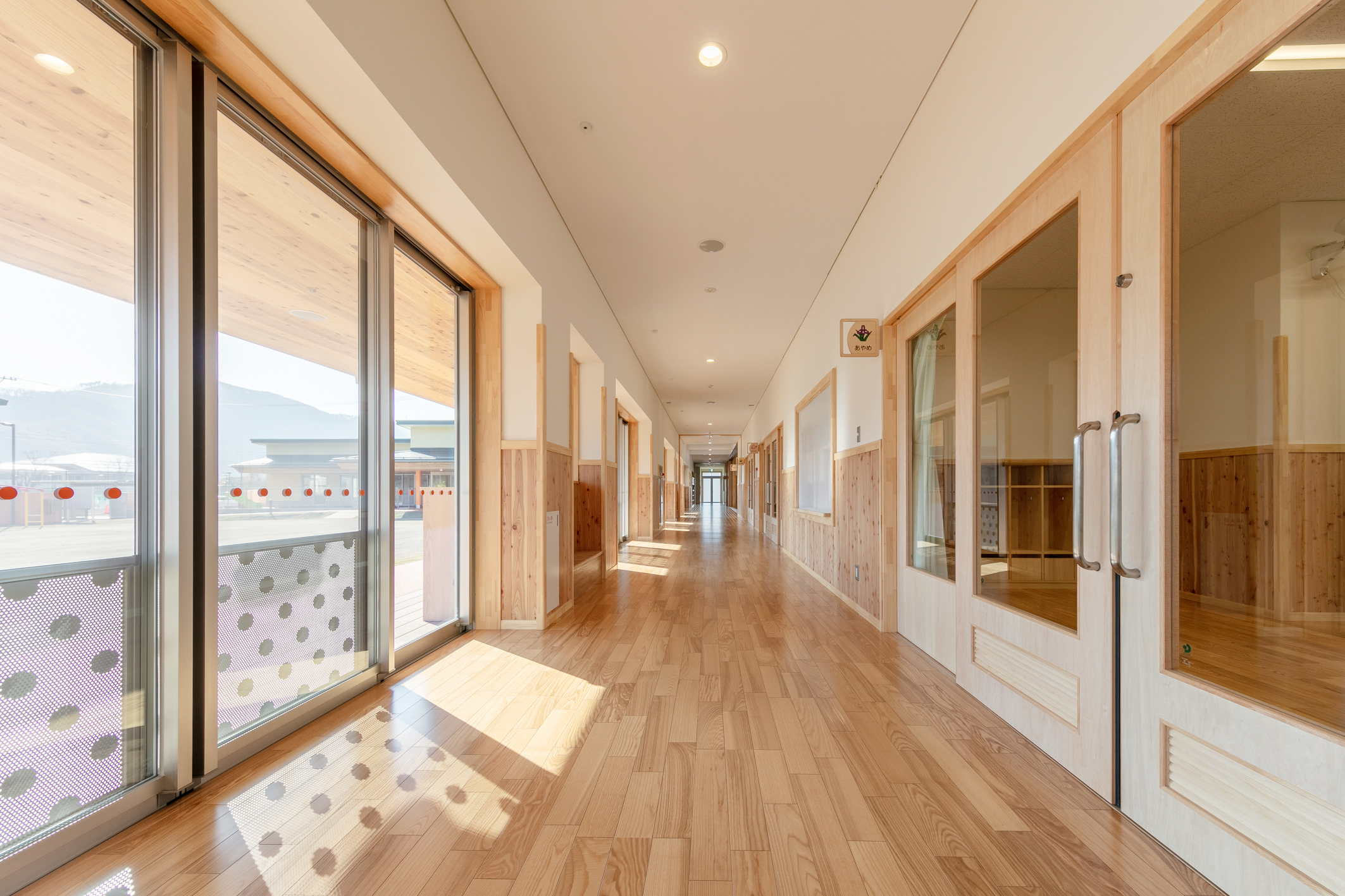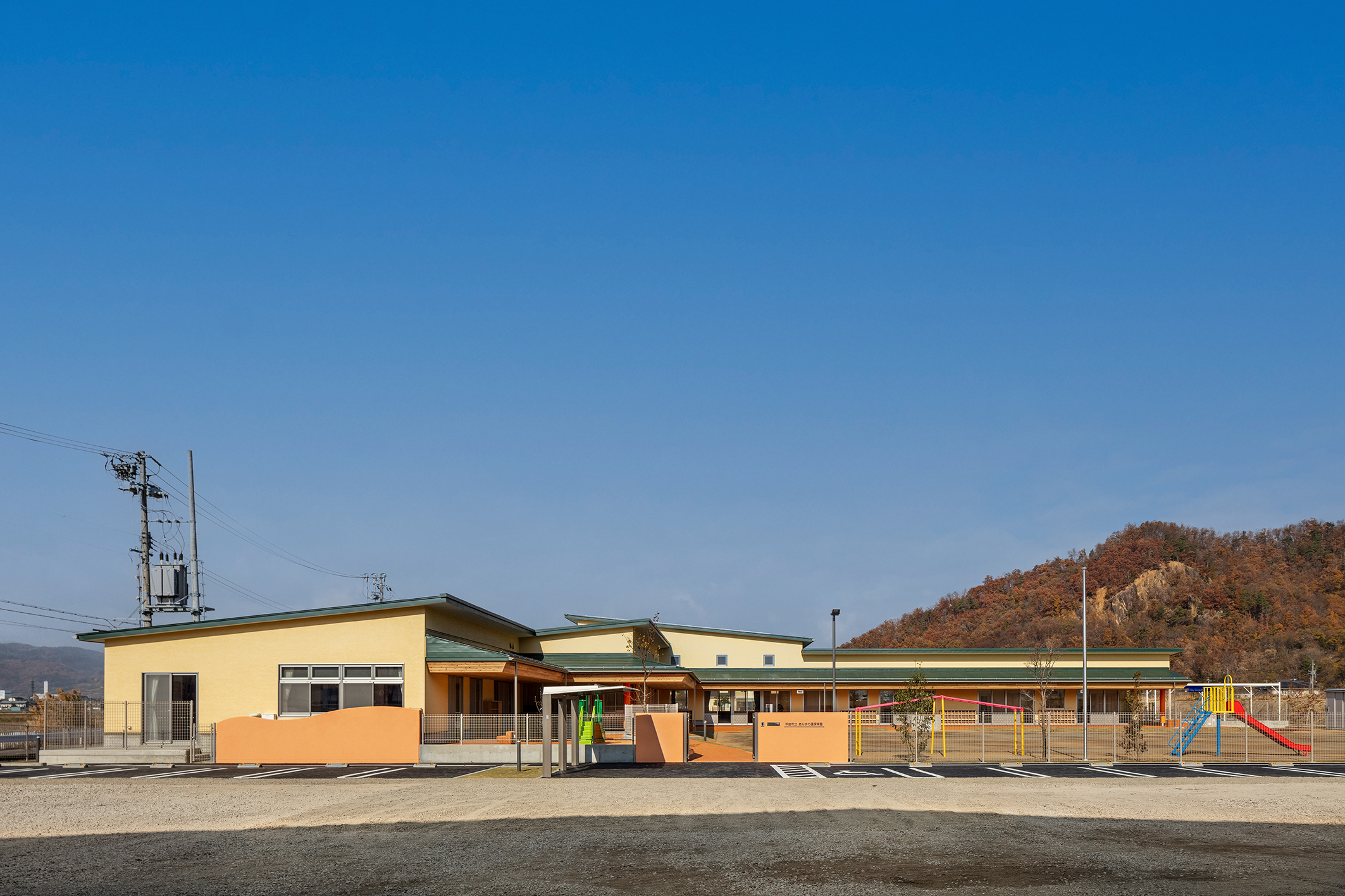 新園舎は、鉄骨造平屋建ての延床面積約1090平方メートルで、長時間保育室や遊戯室を備えています。長野県産材を中心に使用して木質化を図った温かみと安心感のある内装や電気式ヒートポンプを採用した空調など環境にも配慮していることが主な特徴です。