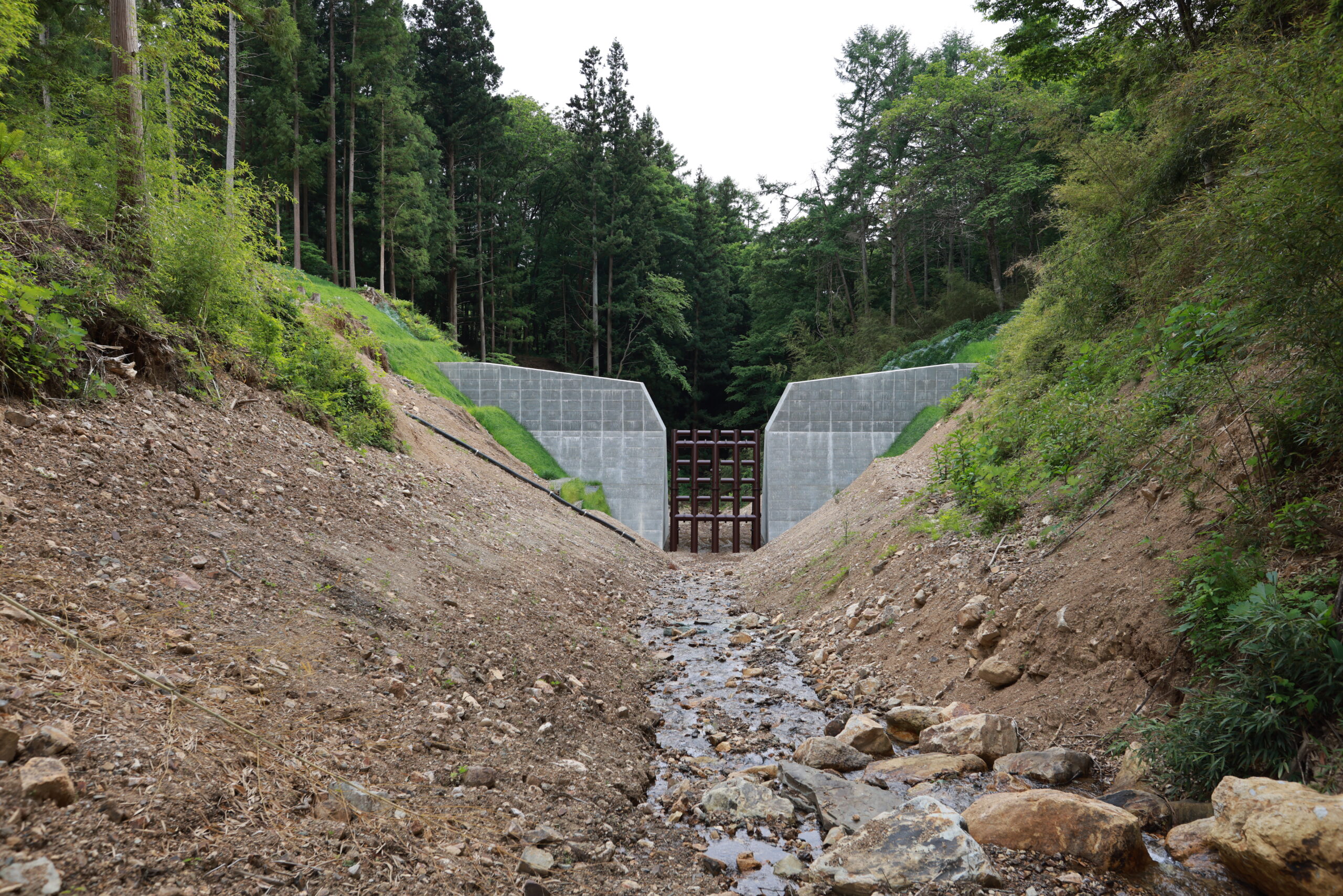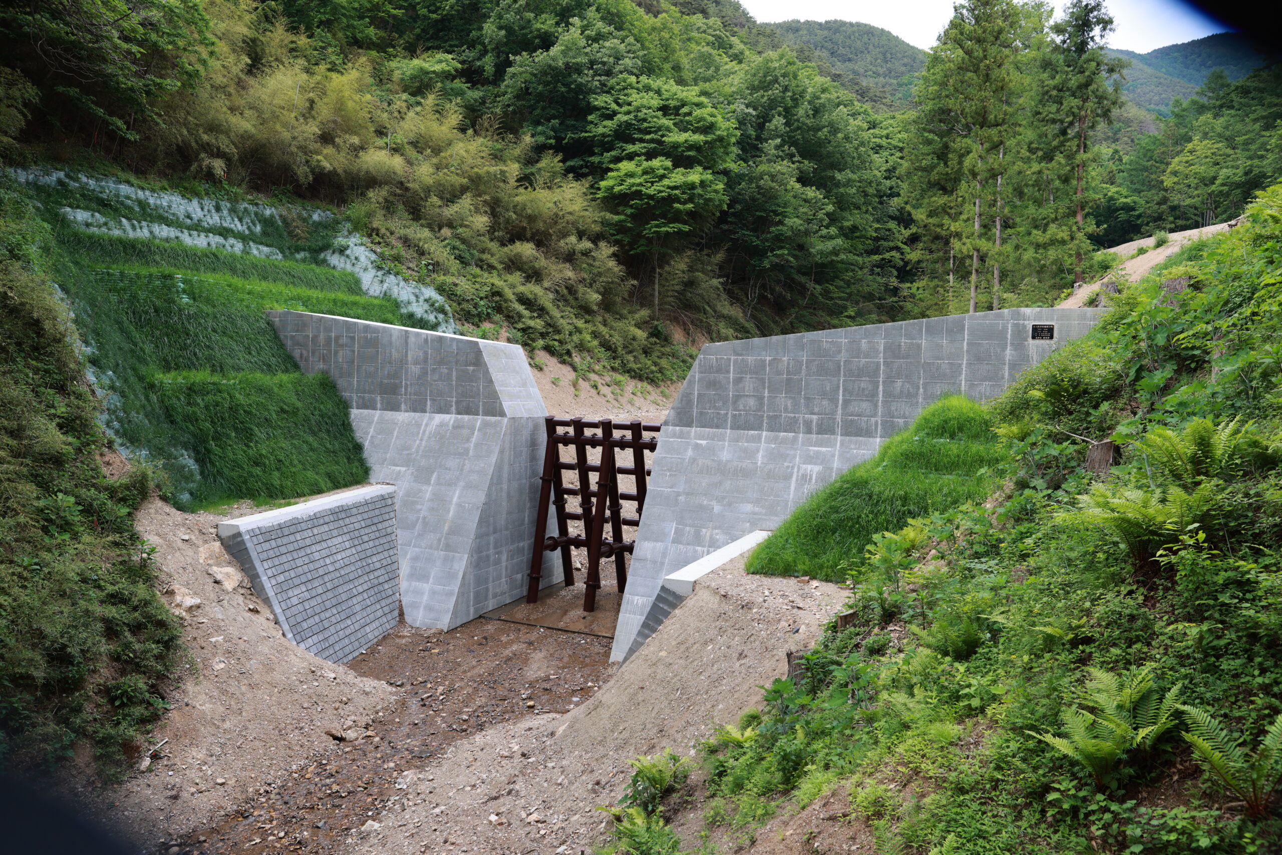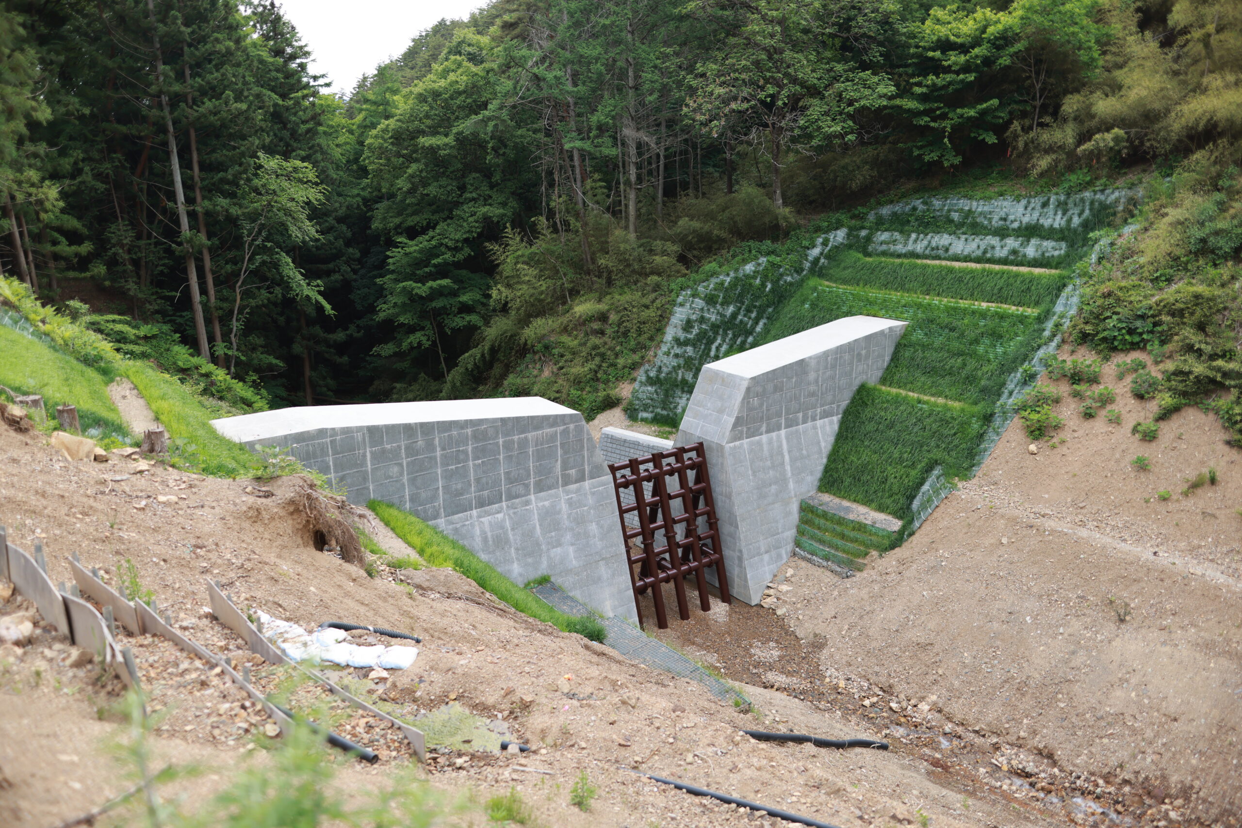 災害時の被害拡大を未然に防ぐため、砂防堰堤の新設と管理用道路の整備を中心とした施工が行われました。砂防堰堤は、高さ9.0m、延長37.0m、体積1,225㎥の規模で構築され、鋼製スリットの設置(13.6t)によって、土石流や流木を効果的に捕捉・制御できる構造となっています。