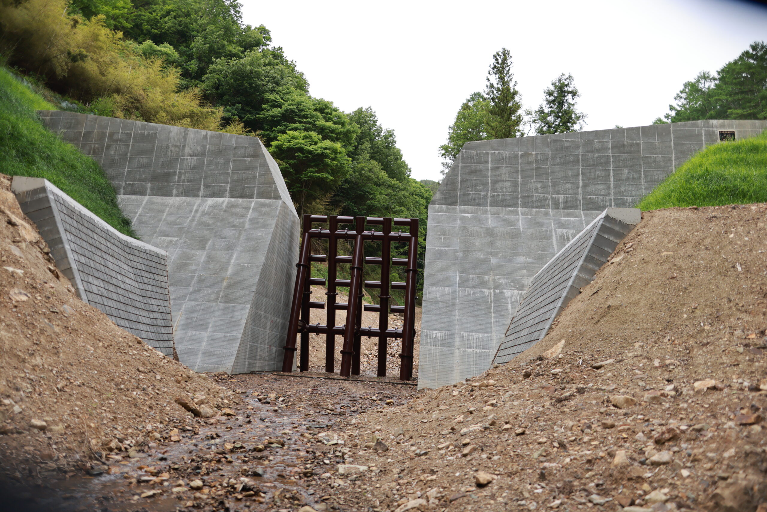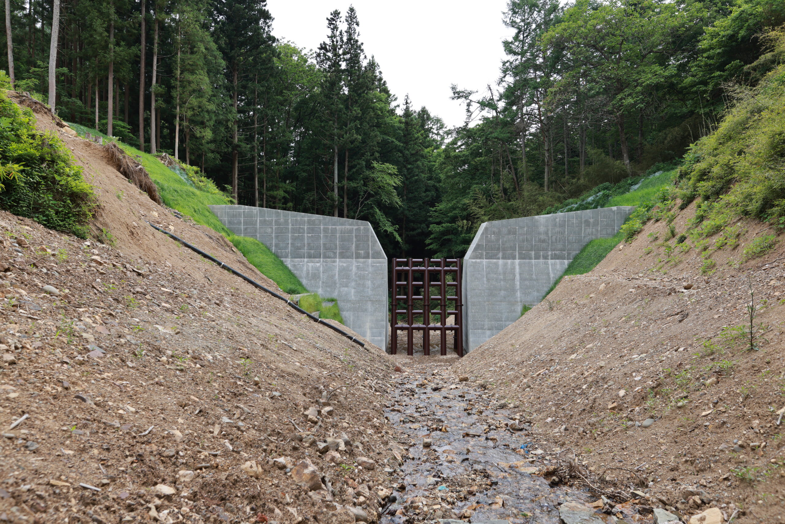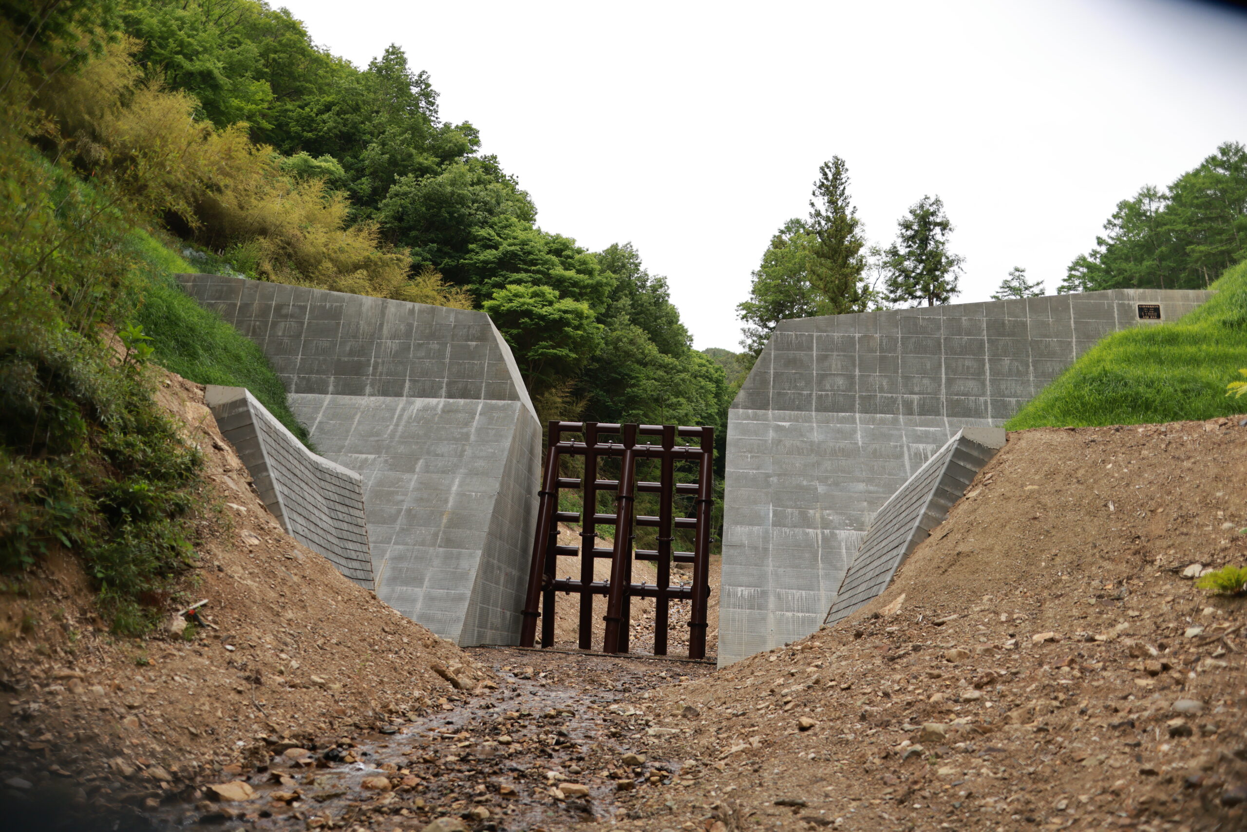 災害時の被害拡大を未然に防ぐため、砂防堰堤の新設と管理用道路の整備を中心とした施工が行われました。砂防堰堤は、高さ9.0m、延長37.0m、体積1,225㎥の規模で構築され、鋼製スリットの設置(13.6t)によって、土石流や流木を効果的に捕捉・制御できる構造となっています。