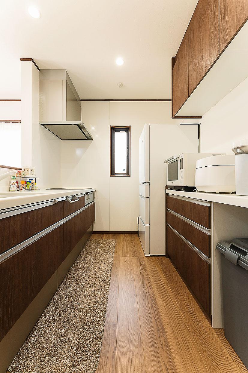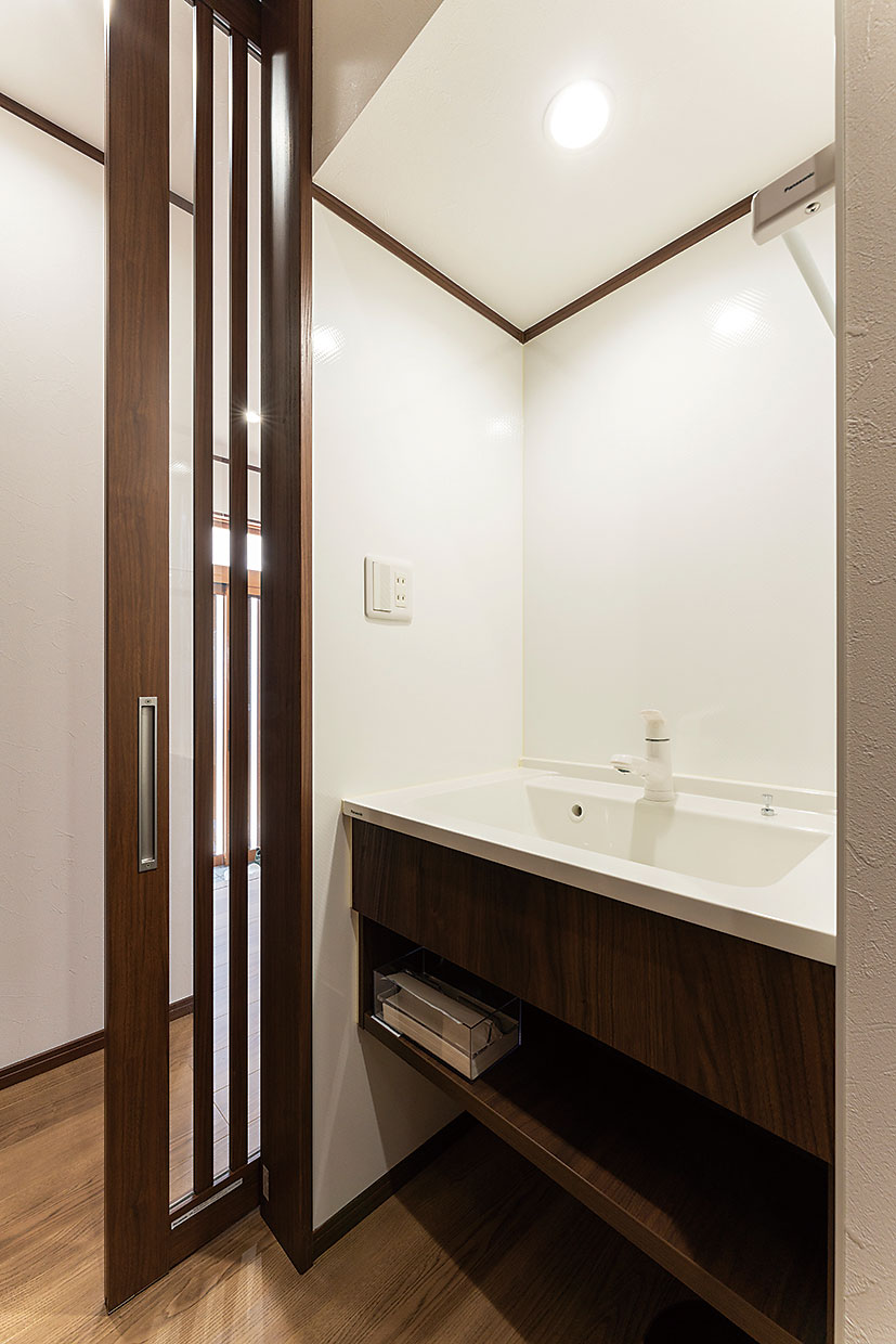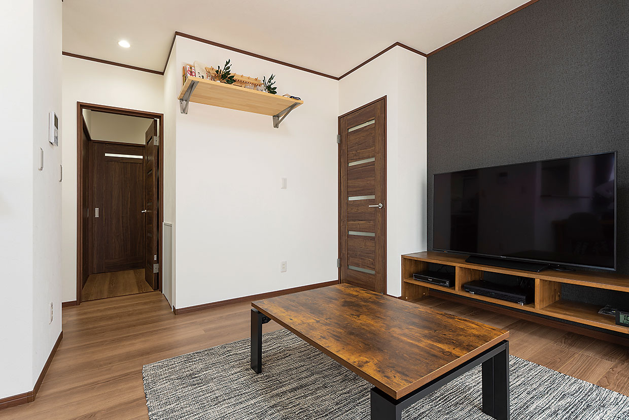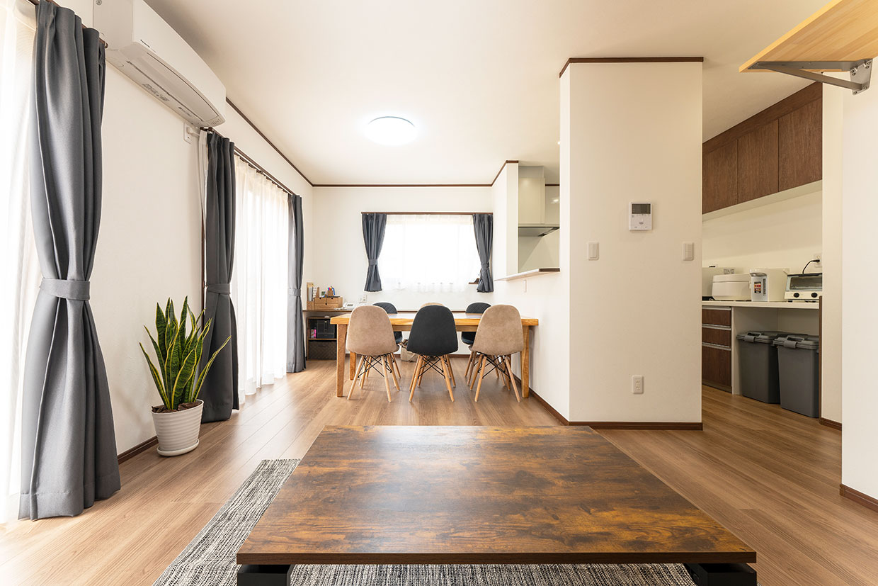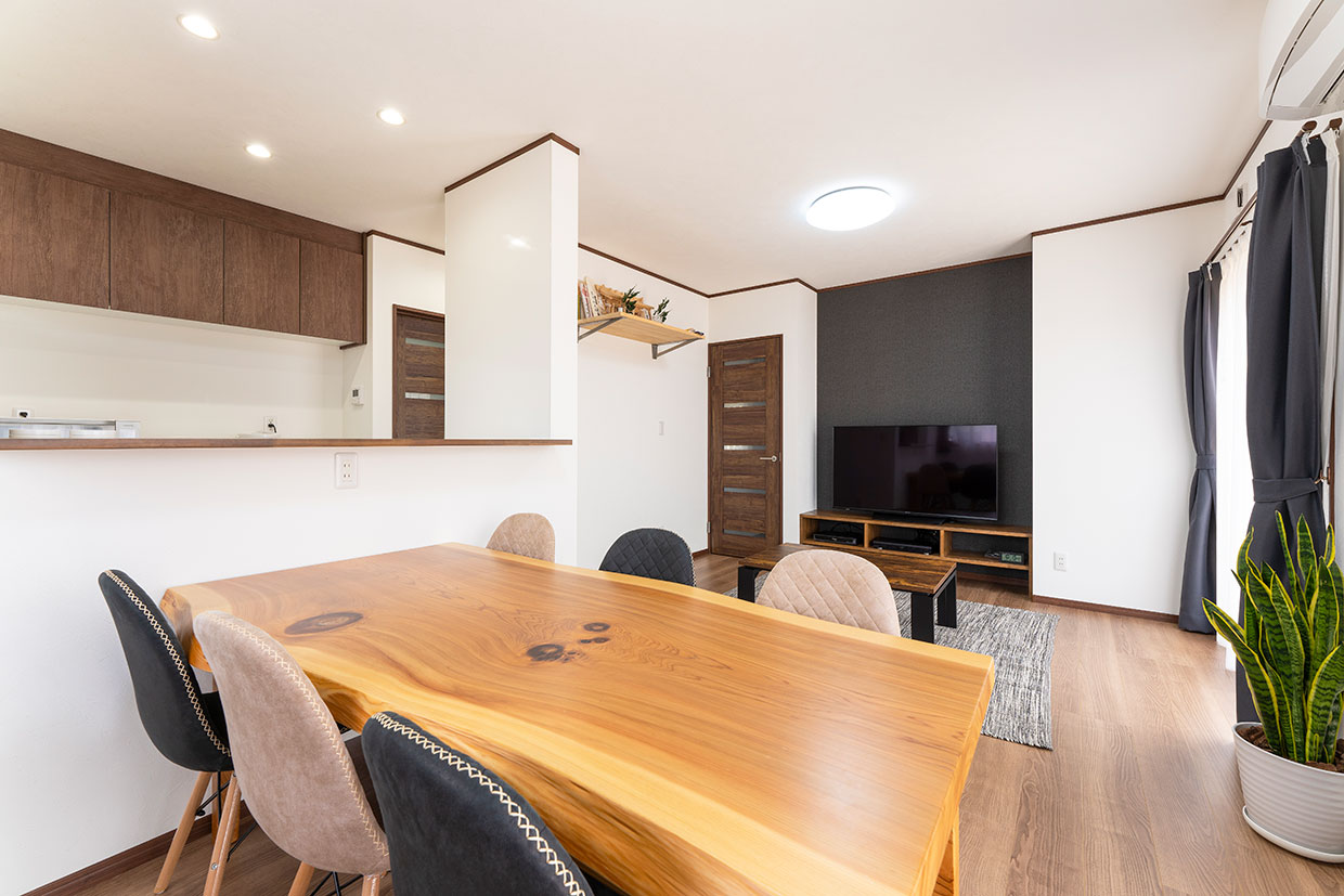 家族のつながりを感じられるように、空間のつながりと動線にこだわったLDK。和の落ち着きと現代的なデザインが調和した、和モダンテイストの心地よい空間です。自然素材の温もりと、家族が集う安心感に包まれた、くつろぎの住まいが完成しました。
